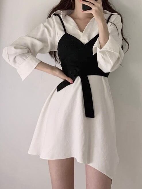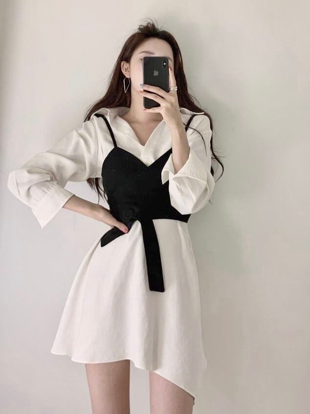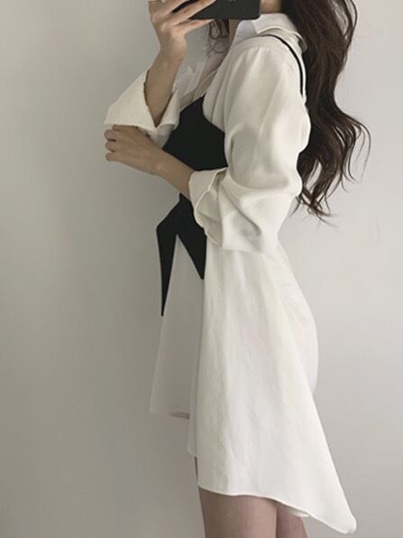 ダダグランデ ワンピース シャツワンピース セットアイテム ビスチェ 長袖 白 ホワイト オルチャン 参戦服 双子コーデ 韓国ファッション レディース服