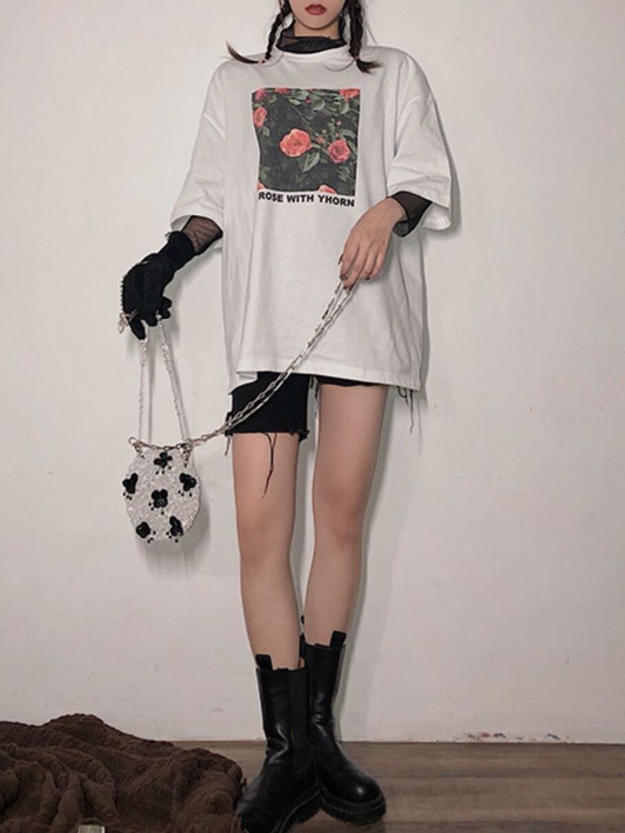 ダダグランデ トップス Tシャツ プリントT ビッグシルエット オーバーサイズ ルーズ オフショルダー ドロップショルダー ローズ 薔薇 半袖 ホワイト 白 ストリート オルチャン 参戦服 双子コーデ 韓国ファッション レディース服