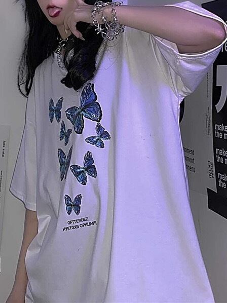 ダダグランデ トップス Tシャツ プリントT ビッグシルエット オーバーサイズ ルーズ オフショルダー ドロップショルダー バタフライ モルフォ 蝶 半袖 ホワイト 白 ストリート オルチャン 参戦服 双子コーデ 韓国ファッション レディース服