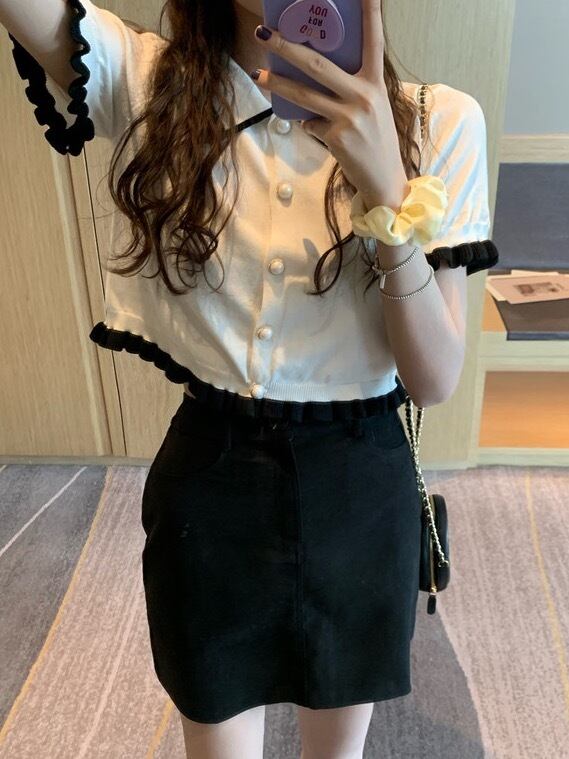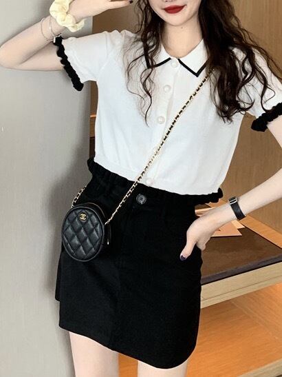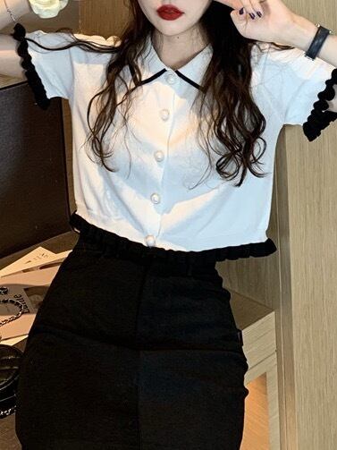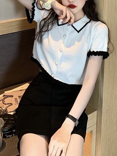 ダダグランデ トップス ポロT ポロシャツ Tシャツ フリル 半袖 ホワイト 白 黒 フェミニン おパリ おパリ女子 オルチャン 参戦服 双子コーデ 韓国ファッション レディース服