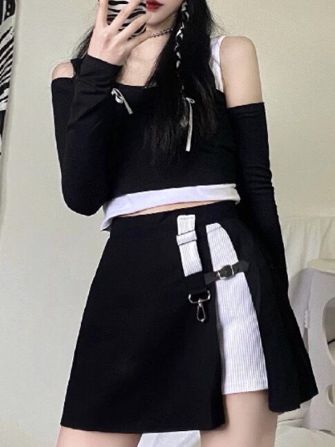 ダダグランデ セットアップ セットアイテム トップス スカート ストレッチ リラックス オフショルダー ブラック 黒 ホワイト モノトーン ストリート カジュアル キレイ目 オルチャン 参戦服 双子コーデ 韓国ファッション レディース服