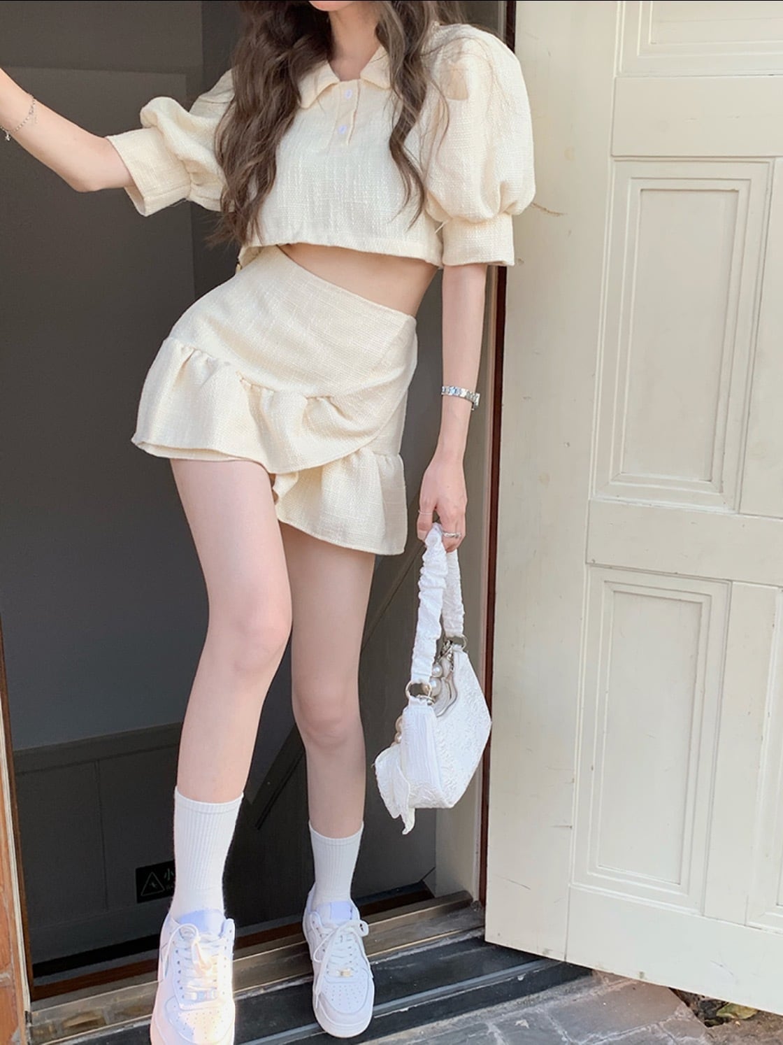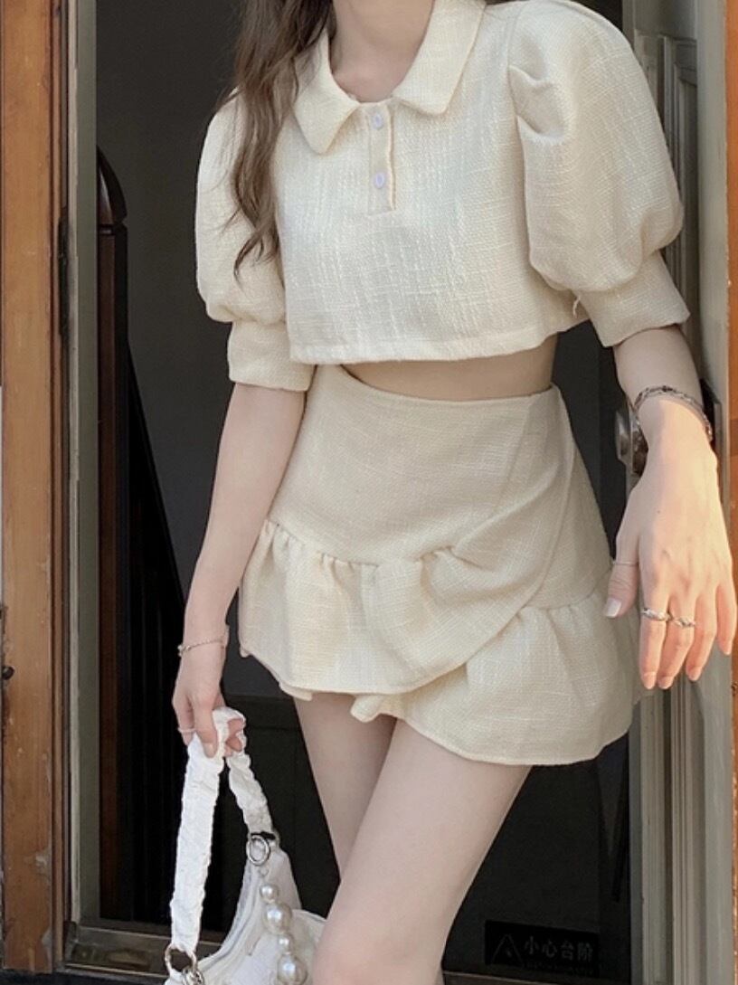 ダダグランデ セットアップ セットアイテム ショートパンツ トップス パフスリーブ 半袖 フリル リボン 白 ホワイト ガーリー ラブリー オルチャン 参戦服 双子コーデ へそ出し へそ出しコーデ 韓国ファッション レディース服