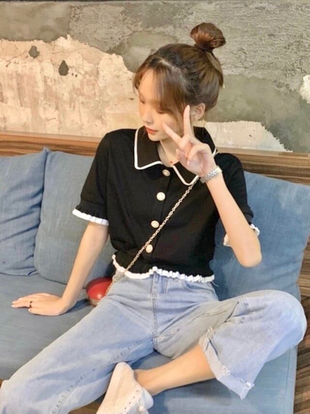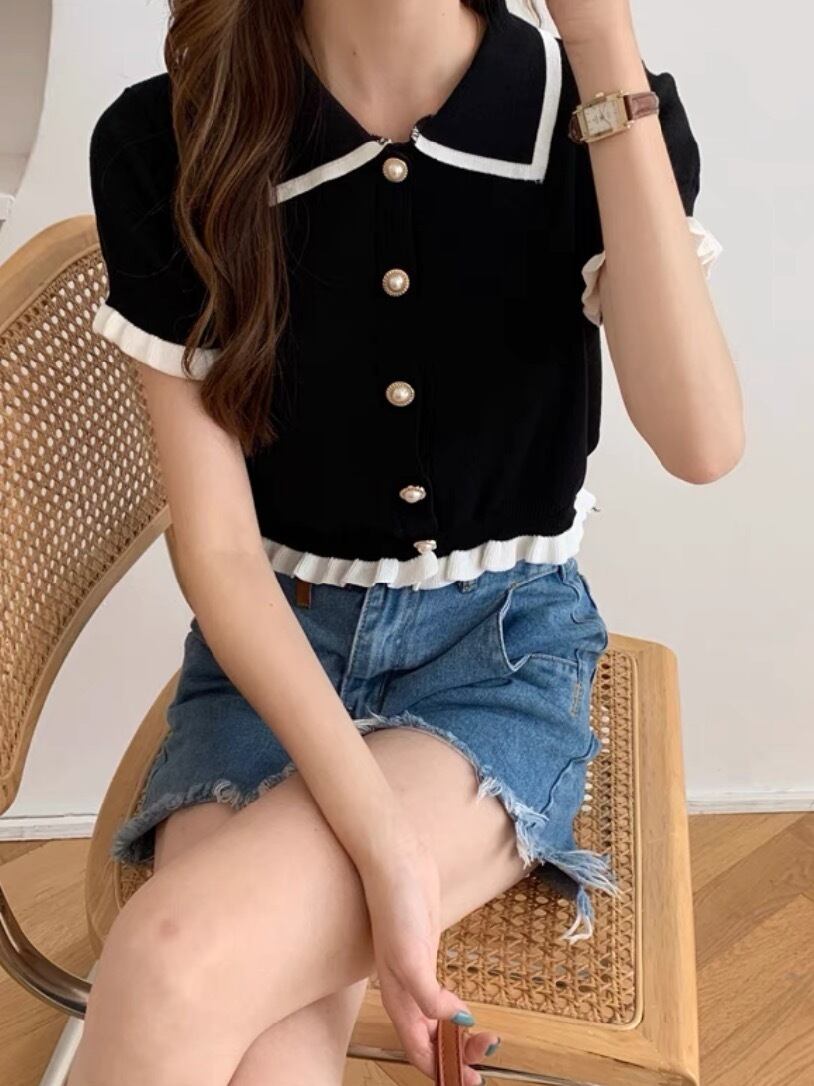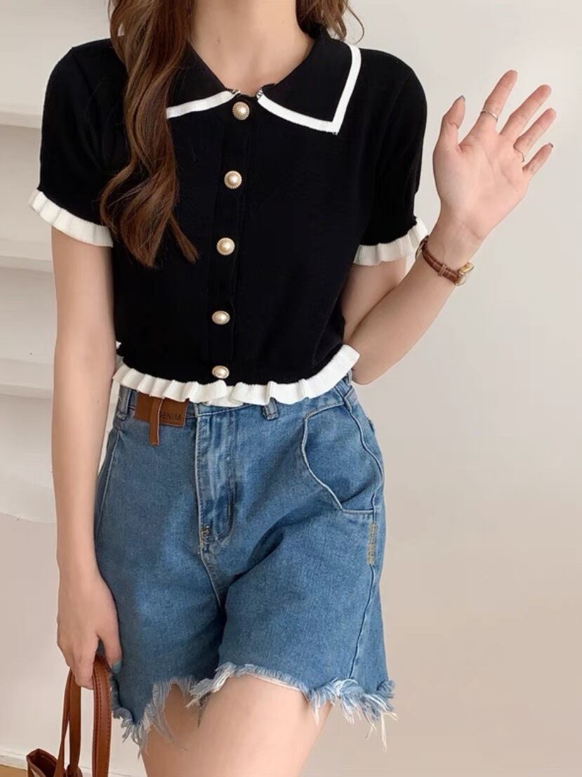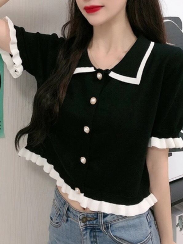 ダダグランデ トップス ポロT ポロシャツ Tシャツ フリル 半袖 ブラック 黒 白 フェミニン おパリ おパリ女子 オルチャン 参戦服 双子コーデ 韓国ファッション レディース服